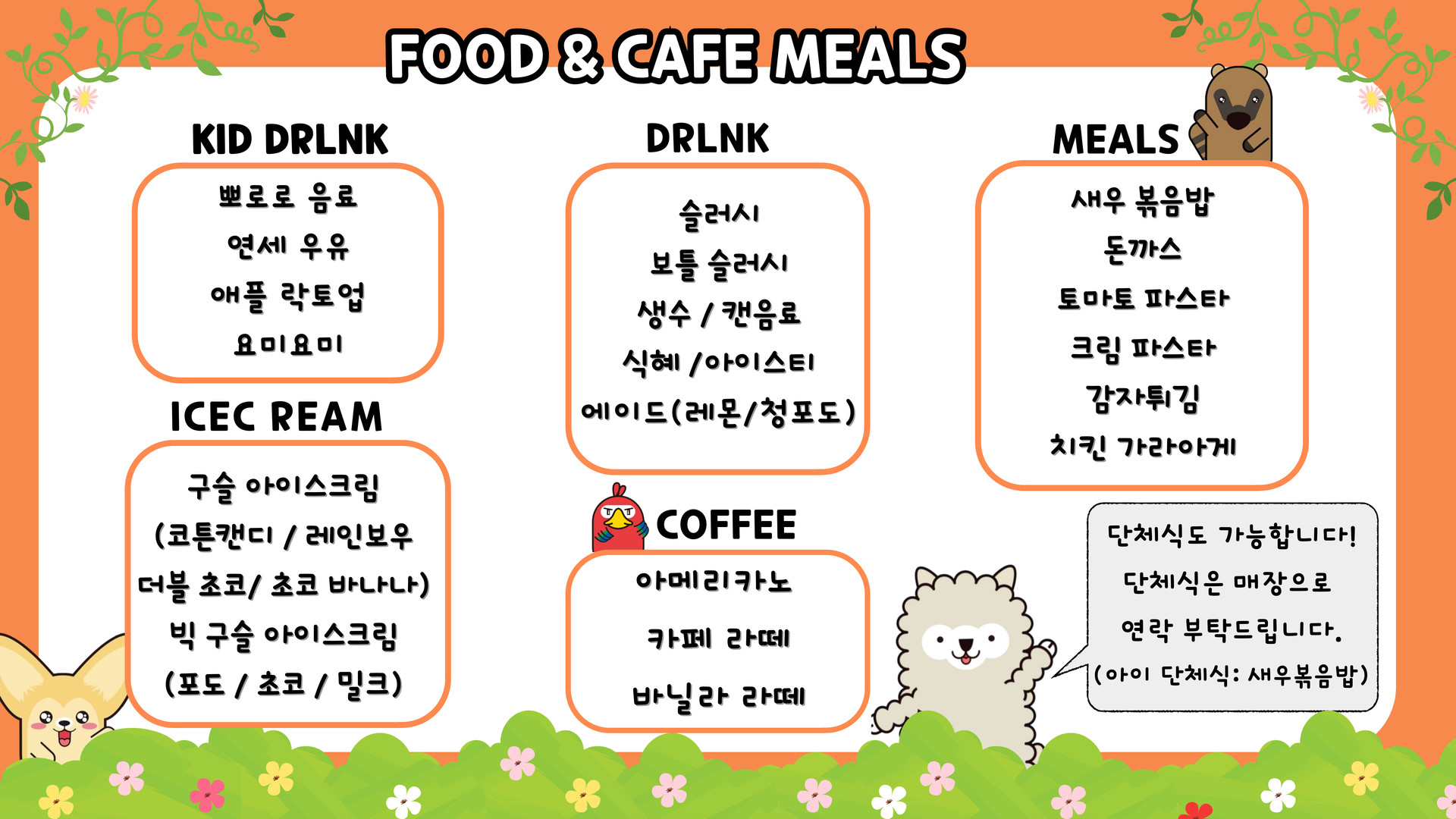 · 아이들의 건강을 위해 식사류는 '직화' 조리로 제공됩니다.